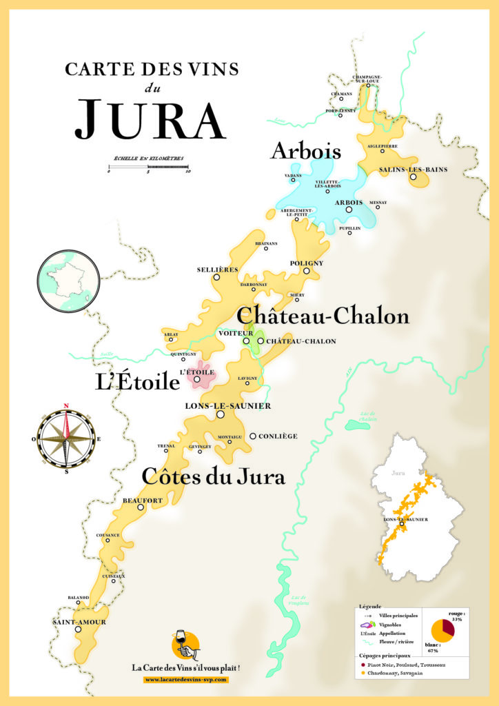 Le Jura se distingue par ses vins atypiques. Le plus célèbre, le vin jaune, est élevé plus de six ans sous voile, ce qui lui confère des arômes puissants de noix, d’épices et de fruits secs. La région produit aussi :